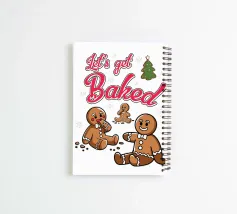 Due personaggi di pan di zenzero sono umoristicamente raffigurati con la frase "Let's get Baked" sopra di loro. Fiocchi di neve e un albero di Natale decorato aggiungono un tocco di festa al disegno.