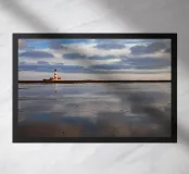 Nuvole e il faro di Westerheversand riflessi nelle acque poco profonde del mare del Nord, parco nazionale Wadden Sea World Heritage, Westerhever, distretto della Frisia Settentrionale, Schleswig-Holstein, Germania, Europa