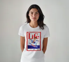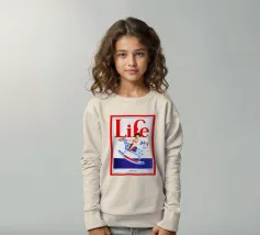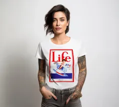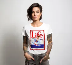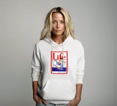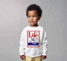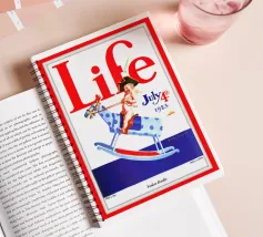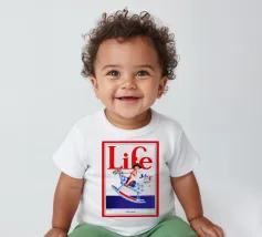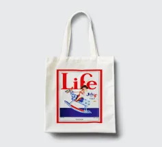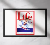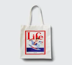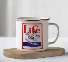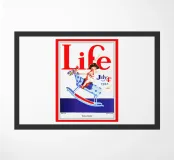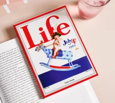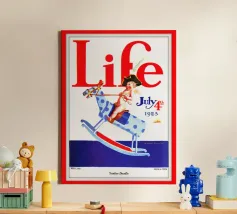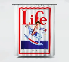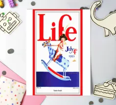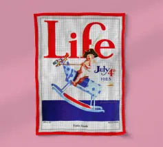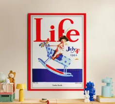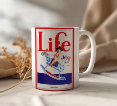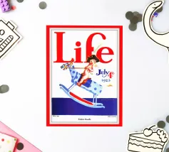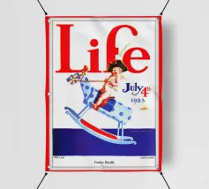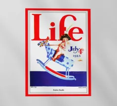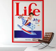 Una giocosa figura di cherubino cavalca un cavallo a dondolo a pois blu sulla copertina di una rivista datata 4 luglio 1923. Le grandi lettere rosse in alto scrivono "Life" e l'illustrazione emana un tema festoso e patriottico.