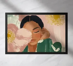 Illustrazione di una donna che tiene in mano 2 gigli. Indossa una giacca rosa a righe.