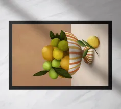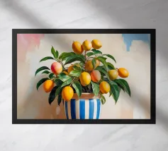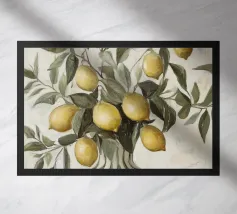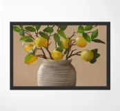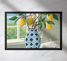 Una natura morta fresca e vivace con un vaso di ceramica pieno di rami di limone. Con i suoi toni caldi e lo sfondo minimalista, quest'opera d'arte porta il fascino mediterraneo e la bellezza naturale in qualsiasi cucina o spazio abitativo.