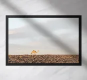 Cammello solitario nel deserto dell'Arabia Saudita. Mentre il sole tramonta.