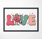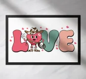 Un personaggio a forma di cuore vestito da cowboy si trova al centro della parola "LOVE", aggiungendo un tocco stravagante al disegno. Il testo è circondato da piccoli cuori.