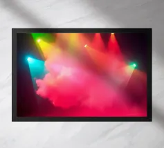 Vibranti fasci di luce colorata penetrano attraverso una nebbia, creando un'atmosfera energica in un luogo vivace durante un evento notturno, probabilmente un concerto o uno spettacolo.