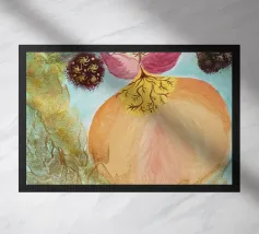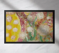 Questo dipinto su sfondo giallo pastello è morbido e rilassante. I fiori colorati contrastano con la semplicità del disegno, creando una sottile armonia.