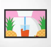 con una macchina per succhi di frutta con intorno vari frutti freschi come ananas, mele, arance, angurie e fragole.