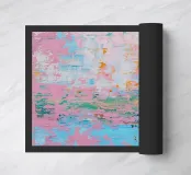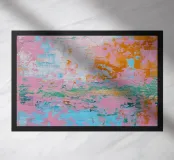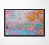Astratto e moderno: Una texture dinamica con la tecnica della spatola crea motivi stratificati in arancione-blu-rosa. Il pastello incontra la facciata di cemento: un collage audace ed elegante di schizzi di colore e tecnica a spatola.