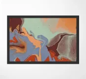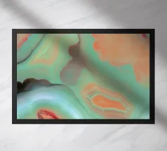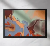 I motivi vorticosi di arancione, blu e marrone scorrono su uno sfondo verde chiaro, creando una composizione dinamica e fluida. I colori si mescolano e si fondono senza soluzione di continuità, evocando l'aspetto di superfici marmorizzate.