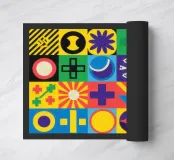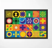Un motivo complesso e vivace composto da una griglia di piastrelle geometriche, ognuna con un disegno e una combinazione di colori unici, che creano una matrice visiva sorprendente.