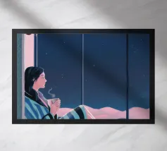 Una morbida illustrazione minimalista di una donna che sorseggia un caffè accanto alla finestra mentre fuori cade dolcemente la pioggia. Perfetta per chi ama i momenti di intimità, le coperte calde e il suono calmo della pioggia.