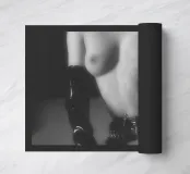 Una giovane donna seduta, in posa in topless con guanti neri e gonna corta