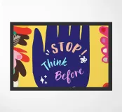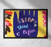 Condividete un messaggio di consapevolezza con questa stampa digitale "Stop Think Before You Act". Questa vibrante illustrazione contemporanea presenta un'audace mano blu scuro che funge da spunto visivo, sovrapposta al chiaro e importante messaggio di testo. Circondato da una vivace serie di forme astratte colorate su uno sfondo giallo sole, il disegno è allo stesso tempo sorprendente e positivo. Questo messaggio grafico è perfetto per incoraggiare la consapevolezza e l'azione riflessiva in qualsiasi spazio. Questa riproduzione digitale di alta qualità vanta una risoluzione di 7000x5000 pixel a 300 dpi, che garantisce chiarezza e brillantezza eccezionali.