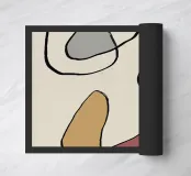 Una composizione astratta caratterizzata da linee nere fluide che formano forme irregolari riempite da colori tenui come il grigio, il marrone e il rosso. Lo sfondo è di un morbido colore bianco sporco che esalta la semplicità e l'eleganza del disegno.