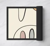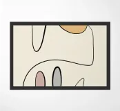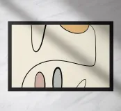 Un disegno lineare minimalista è caratterizzato da linee nere fluide e forme colorate in tre tonalità di marrone, rosa e grigio. Il disegno crea un senso di movimento e semplicità su uno sfondo neutro.