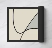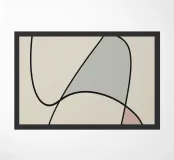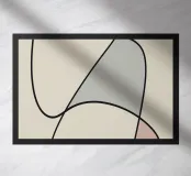 Forme astratte in colori tenui sono collegate da sottili linee nere, creando un design minimalista. Le forme includono toni morbidi di giallo, grigio e rosso, su uno sfondo beige neutro.