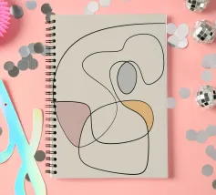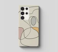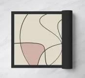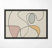 Linee nere curve formano un disegno astratto su uno sfondo beige chiaro, intersecandosi per creare varie forme chiuse. Alcuni spazi sono riempiti da morbide tonalità della terra, come il rosa tenue, il grigio e il giallo.