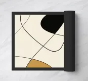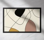 Forme astratte nei toni della terra sono intervallate da linee nere sottili e fluide su uno sfondo neutro. La composizione crea un senso di movimento ed equilibrio.
