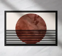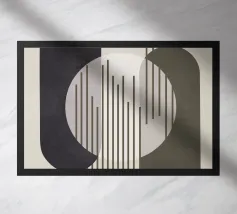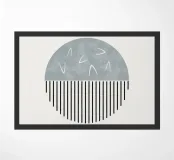 Opera d'arte digitale minimalista con linee nere come pennellate e forme astratte bianche in un cerchio. Disegno astratto in colore blu pastello e sfondo beige per interni boho, minimalisti, industriali o moderni. Se preferite la semplicità e l'eleganza, questa è un'opera d'arte digitale equilibrata.