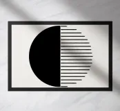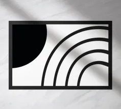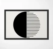 Opera d'arte geometrica minimalista con linee nere e un semicerchio nero su uno sfondo beige neutro e morbido. Opera d'arte astratta e moderna con texture morbide per gli stili di interni Bohemien, Moderno, Industriale e Basic. Bella per il soggiorno, lo studio o l'ufficio.