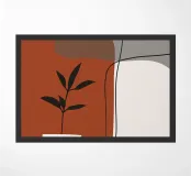 Il design minimalista è caratterizzato da una semplice pianta in vaso con foglie scure, contrapposta a forme astratte e sovrapposte nei toni terrosi del rosso, del grigio e del bianco. Le linee pulite e i blocchi di colore decisi creano un'estetica moderna e rilassante.