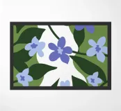Illustrazione di un motivo ripetuto con fiori blu e viola, foglie verde scuro e sfondo bianco.