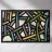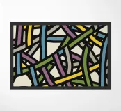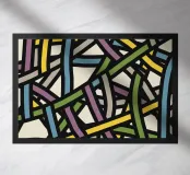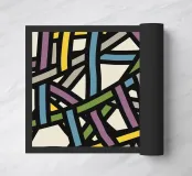 Una varietà di linee spesse e sottili si incrociano e si sovrappongono su uno sfondo chiaro, creando un disegno intricato. Segmenti colorati nei toni del blu, del verde, del giallo e del viola aggiungono un vibrante contrasto alle linee nere.