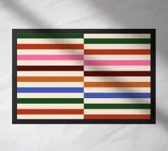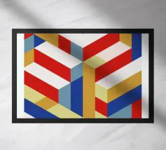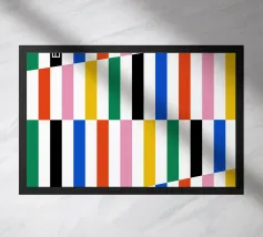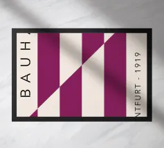 Questo espressivo design Bauhaus combina strisce di colore verticali e triangoli grafici per creare un quadro d'insieme ritmico ed energico. Linee chiare, colori vivaci e un gioco geometrico di movimento e struttura: un'opera d'arte moderna che illuminerà qualsiasi ambiente.