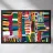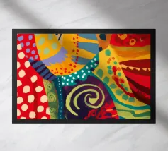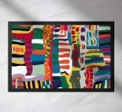 Un complesso e vivace motivo astratto di strisce verticali, simili a totem, riempite con varie forme geometriche, linee e motivi, che creano una composizione visivamente stimolante.