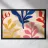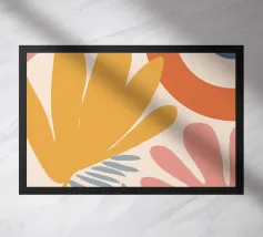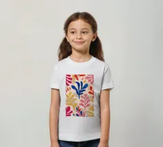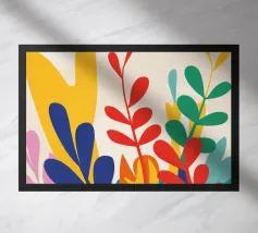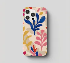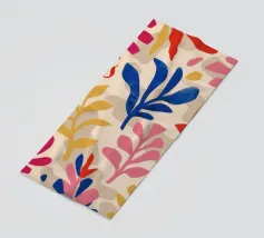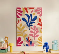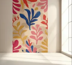Un motivo vivace e senza soluzione di continuità di foglie stilizzate e forme botaniche in una tavolozza di rosso, blu, rosa e giallo, che crea un senso di movimento ritmico e naturale.