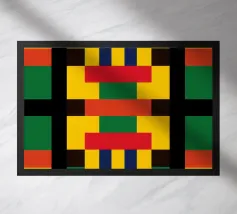 Un motivo geometrico composto da vari rettangoli, con sezioni definite da sfumature di grigio e strisce orizzontali in colori contrastanti come rosso, blu e verde. La disposizione crea un effetto visivo strutturato e vibrante, con i colori che formano una struttura a griglia.