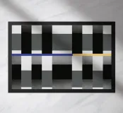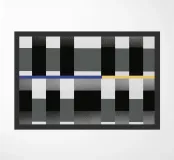 Un motivo geometrico composto da vari rettangoli, con sezioni definite da sfumature di grigio e strisce orizzontali in colori contrastanti come rosso, blu e verde. La disposizione crea un effetto visivo strutturato e vibrante, con i colori che formano una struttura a griglia.