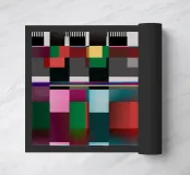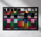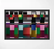 Una composizione astratta presenta una serie di forme geometriche e di colori vivaci disposti a griglia. Blocchi di colore distintivi sono intervallati da elementi lineari, creando un design visivamente dinamico e moderno.
