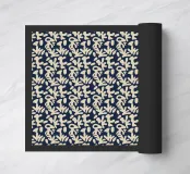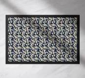 Un motivo ripetuto presenta forme astratte beige su uno sfondo blu scuro, creando un senso di simmetria e ritmo. Il design evoca un'estetica moderna e minimalista.