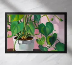 Natura morta contemporanea di una pianta di monstera in un vaso blu. Lo sfondo è un'audace composizione di forme astratte a colori bloccati nei toni della terra, che fonde forme naturali e arte moderna.