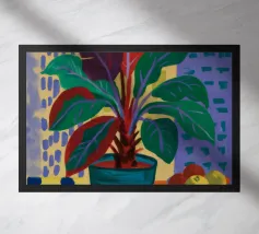 A vibrant still life of a monstera plant in a yellow pot, set against a background of colorful, abstract patterns. The composition is a lively and playful mix of natural forms and modern design.