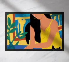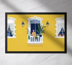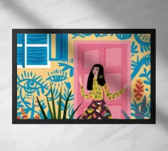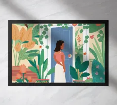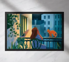 Una tranquilla scena serale di una donna e del suo gatto seduti accanto a una porta aperta, circondati da piante rigogliose e dalla tenue luce della luna. La composizione delicata è sognante e femminile, con linee pulite e calma pastello. Realizzata per portare un po' di silenzio e di energia lenta nella vostra giornata.