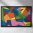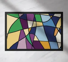 Forme geometriche di vari colori segmentano ordinatamente lo spazio, creando un mosaico di forme astratte. Sfumature di blu, verde, viola, rosso e giallo si intersecano con i contorni neri per dare un effetto vetro colorato.