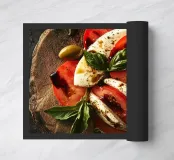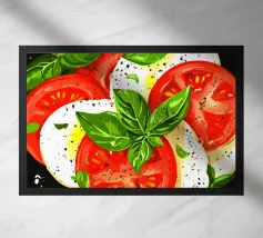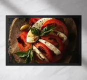 tomatoes mozzarella basil olives wooden platter caprese salad fresh herbs slices dark background olive oil pepper balsamic vinegar simple ingredients fresh produce italian cuisine gourmet presentation appetizer rustic style green leaves natural lighting