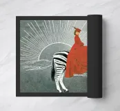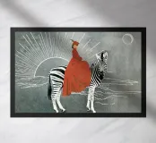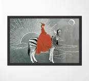 Dipinto vintage di una donna in elegante abito rosso che cavalca la sua zebra verso l'orizzonte al tramonto. Collage a tecnica mista di MsGonzalez