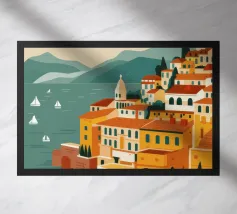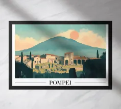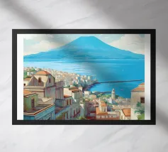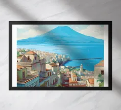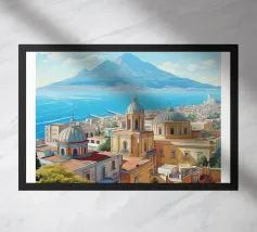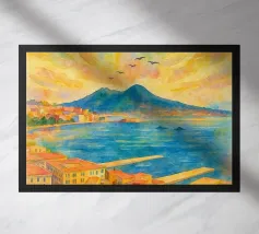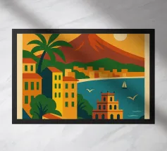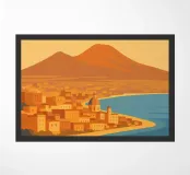Design italiano minimalista con il famoso vulcano Vesuvio e la città di Napoli in primo piano. Tipico paesaggio dell'Italia meridionale con il Mar Mediterraneo e un paesaggio estivo piuttosto brullo e arido e un'iconica montagna.