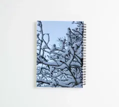 The bluish light shines through the sky on the trees of the forest after a heavy snowfall on a winter morning.