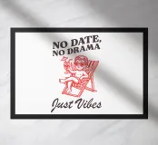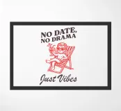 Una scena rilassante mostra un cherubino su una sedia a sdraio che si gode un drink, accompagnato dalla frase "No Date, No Drama, Just Vibes". L'immagine comunica un'atmosfera rilassata e priva di stress.