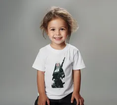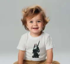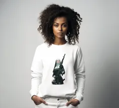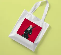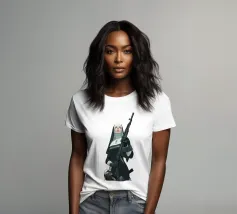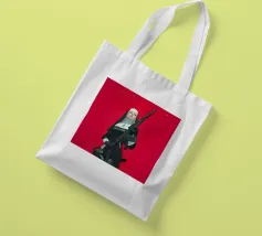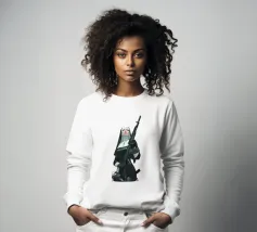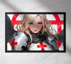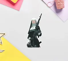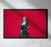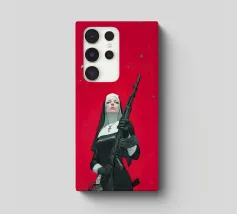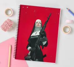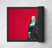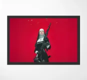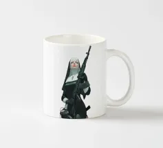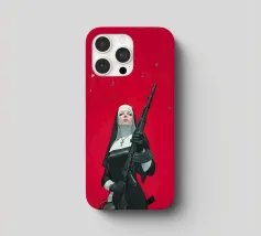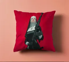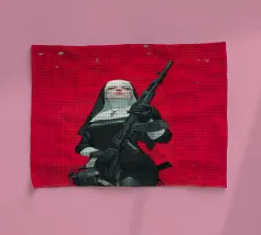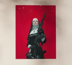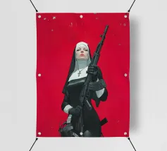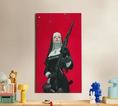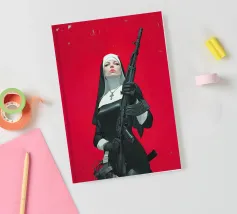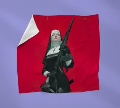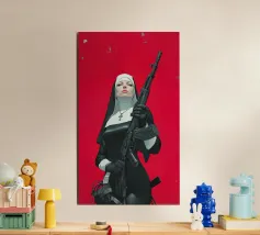 A striking, contemporary illustration that blends sacred iconography with modern tension. A resolute figure in traditional religious attire stands against a bold red backdrop, her calm, unflinching gaze contrasting sharply with the industrial weight of the object she holds. The composition is graphic and iconic, using strong color blocking, clean line work, and controlled realism to create an image that feels both timeless and confrontational.
