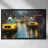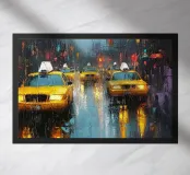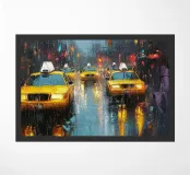 A stunning digital painting of a rainy city street featuring iconic yellow taxis reflecting off the wet pavement. Blurred traffic lights and neon signs create a moody, atmospheric scene, capturing the essence of urban life and movement.