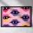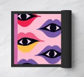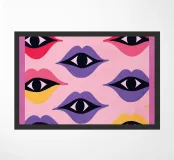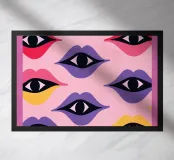 Illustrazione surreale di occhi e labbra con motivi pop art colorati e audaci forme geometriche.