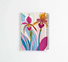 Delicati ed eleganti fiori di orchidea con petali dettagliati nei toni del rosa, del giallo e del viola, su uno sfondo di ampie foglie verdi, che ne catturano la raffinata bellezza.