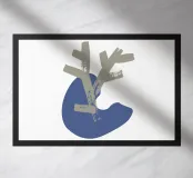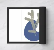 Un disegno minimalista presenta una forma astratta beige a forma di ramo sovrapposta a una forma organica blu. La composizione enfatizza la semplicità e il contrasto su uno sfondo bianco.