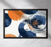 Audaci cerchi sovrapposti in blu e arancione creano un motivo dinamico su uno sfondo chiaro. I bordi ruvidi e strutturati conferiscono un senso di movimento ed energia.