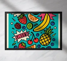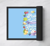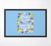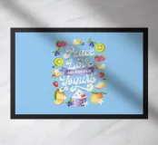 Una citazione divertente con tanta frutta disegnata a mano per la cucina o la zona pranzo. Pace, amore e yogurt gelato. Un motivo tipografico davvero unico. Le lettere sono disegnate a mano e colorate con i freschi e rinfrescanti colori del gelato. La cornice è formata da frutti come mirtilli, kiwi, fragole, mango, lamponi e fiori di vaniglia. È anche un disegno molto bello e adatto per un dolce caffè, per una gelateria, per un grazioso bistrot o ristorante.