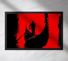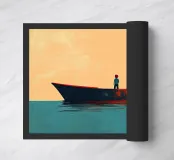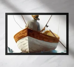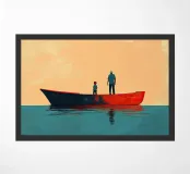 Illustrazione piatta di un uomo anziano e del suo giovane figlio in piedi sul bordo della loro piccola barca rossa, con l'acqua blu chiaro sotto di loro. Lo sfondo è costituito da toni tenui di arancione e giallo chiaro, che creano un'atmosfera serena. Questa scena minimalista trasmette un senso di calma e il legame tra padre e figlio in armonia.